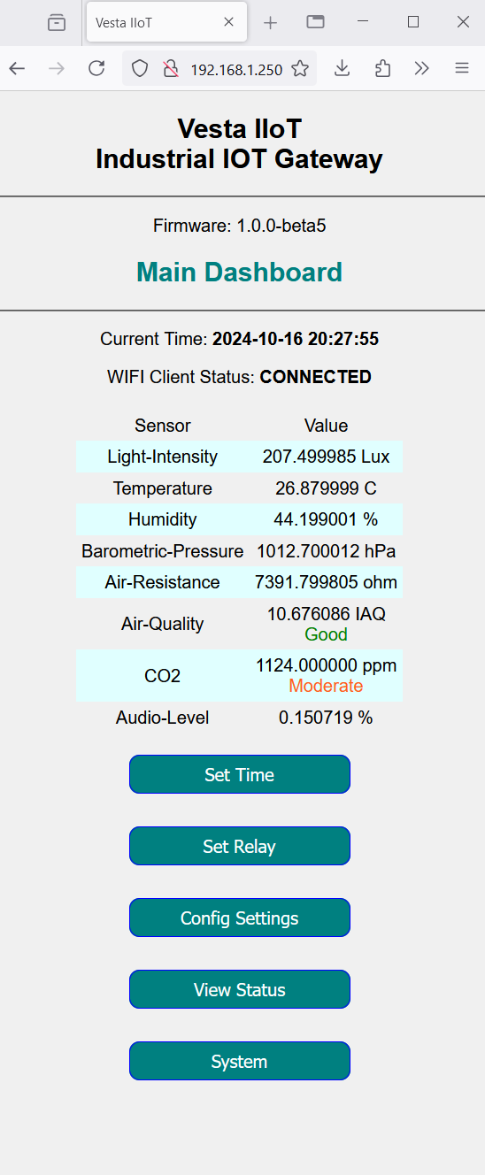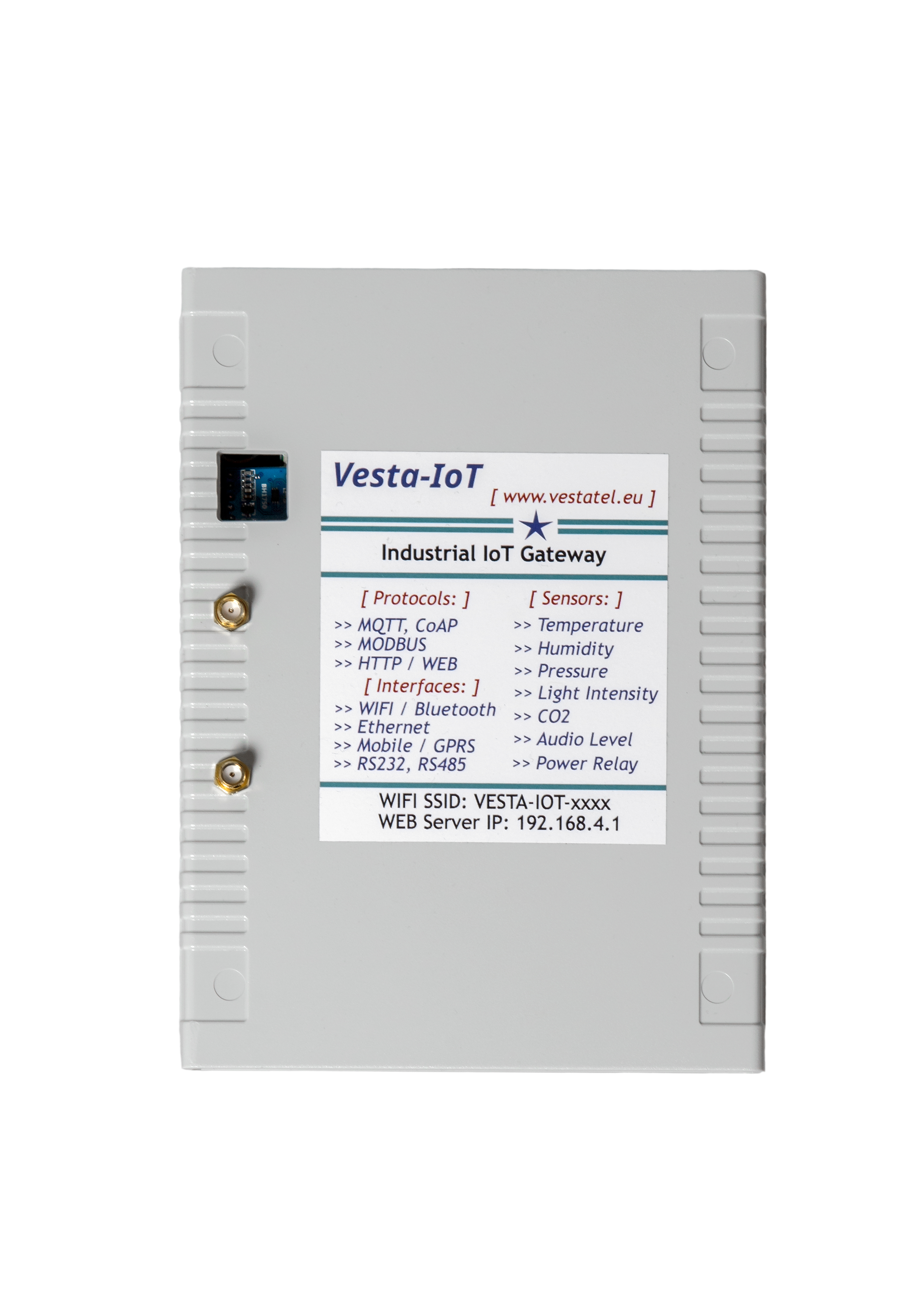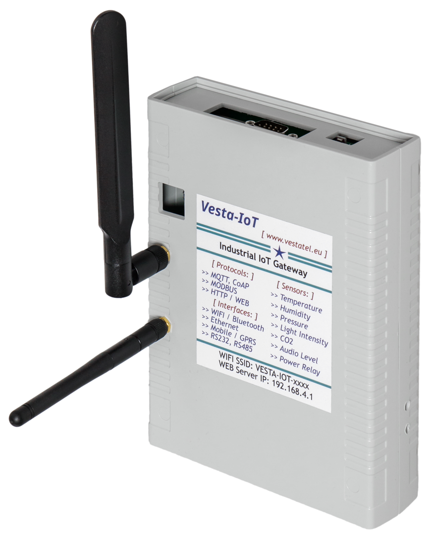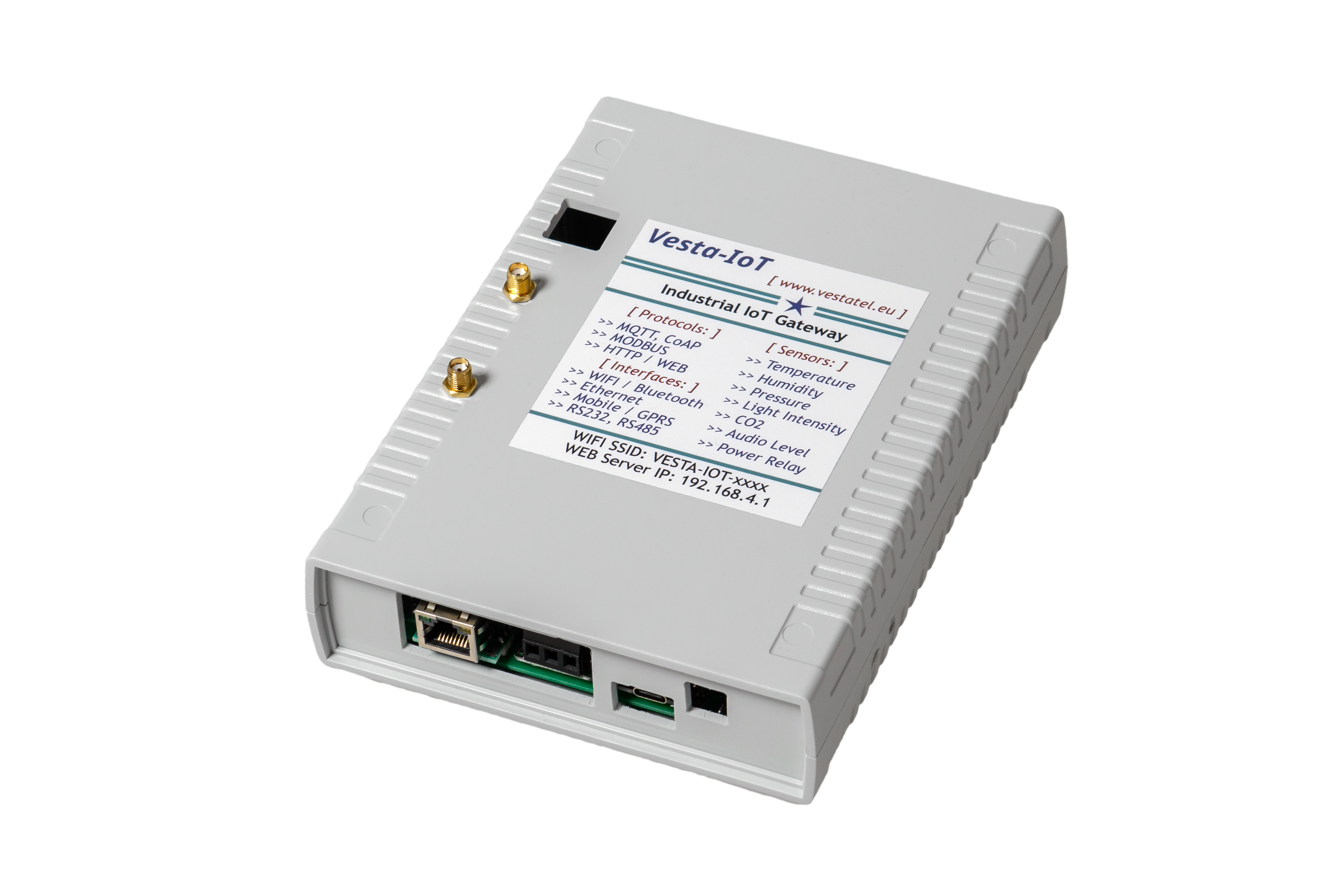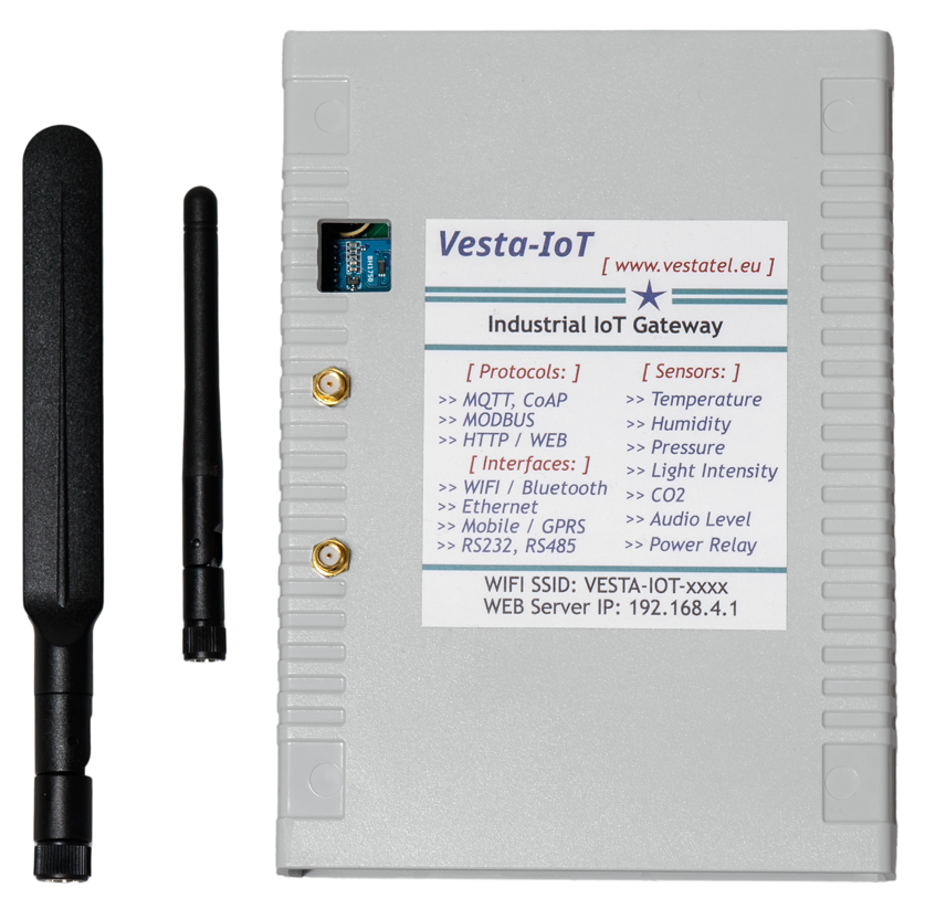 Vesta-IoT is an Industrial Internet of Things (IoT) Gateway. It continuously monitors multiple on-board sensors - Temperature, Humidity, Pressure, Light Intensity, CO2 concentration, Air Resistance, Audio / Noise Level. On each sensor poll cycle Vesta-IoT re-calculates Air Quality Index (IAQ) given the relative humidity and air resistance and exposes IAQ as another sensor value. Vesta-IoT can periodically send the sensor readings using MQTT and also makes the data available using MODBUS, DNP3, IEC 60870-5-104, CoAP and HTTP / SOAP protocols.