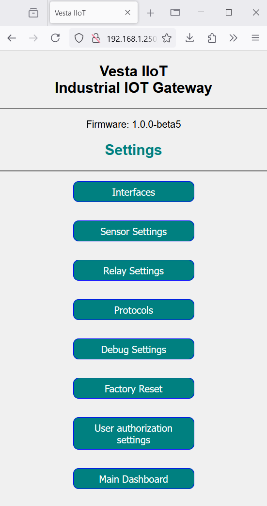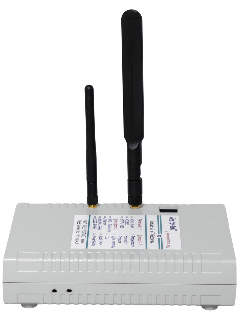 The device also features an on-board AC power relay and various communication interfaces: WIFI, wired Ethernet, GSM/LTE/GPRS, RS232, RS485. Additionally Vesta-IOT acts as a data logger, saving sensor readings to non-volatile memory that can be later retrieved as a CSV file or viewed via Web UI